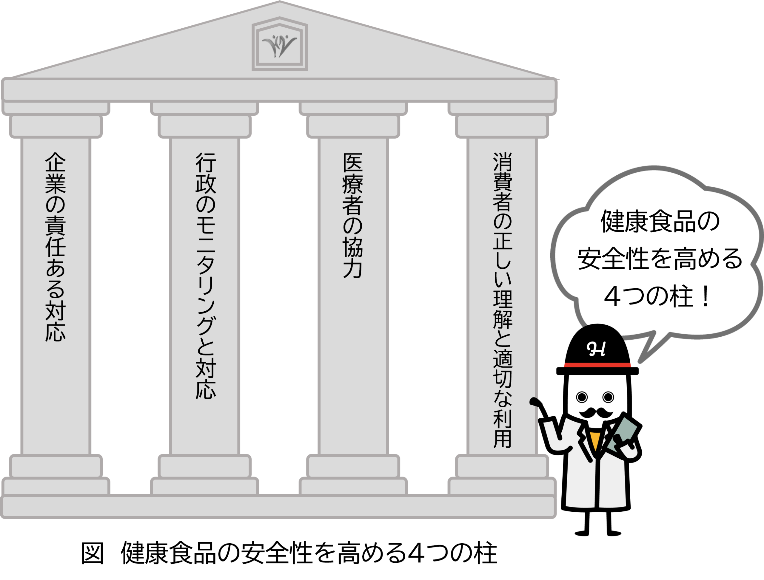 今後は、企業の責任ある対応、行政のモニタリングと対応、医療者の協力、そして消費者の正しい理解と適切な利用という“四つの柱” (下図) で、より安全性を高めていくことが求められます。この事件を教訓として、健康食品が本当の意味で健康の維持増進に寄与するものとなるよう、社会全体で意識を高め、さらに仕組みの整備を図っていくことが重要です。